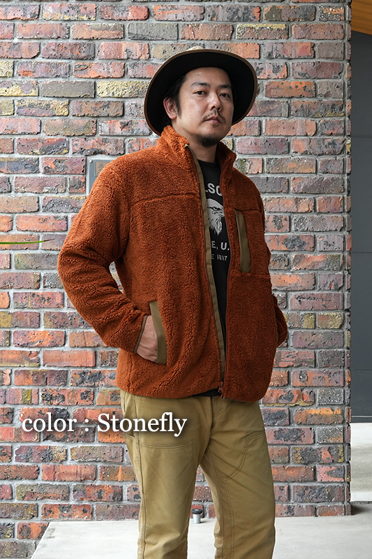 シムス2025年秋冬における推しアイテムのひとつがこちら「コールドウェザーフリース」。クラシックなボアフリースタイプのジャケットで、厚みもありアウター的要素も備える一枚です。
