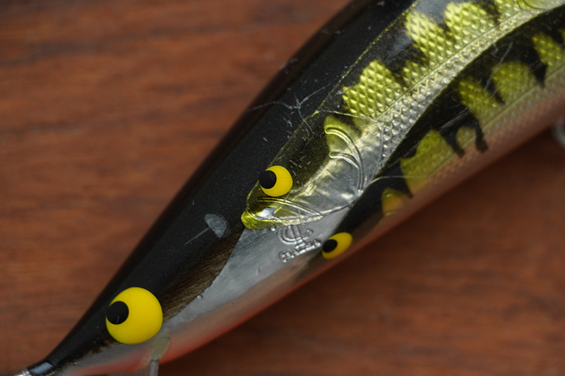 これは僕が使っていたモンスタープロデューサー145です。「分身の術1st」では多くのイトウを手にしてきました。眺める度にイトウ達を想い出します。背中のブラックバックはこのようにギザギザに塗り分けられ、トン魚をイメージ。その黒い背中にポツポツと白く剥がれたような痕はすべてイトウの歯痕です。