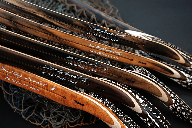 私たちが勝手に「あと縮み杢」と呼んでいる変形現象が起こった個体達です。カスケットのボロンハンドルやベゼルグリップは通常、製作される工程で真空樹脂含浸などを施し、釣具としての防水性を持たせると同時に杢が変形などを起こさないよう徹底的に処理してあります。