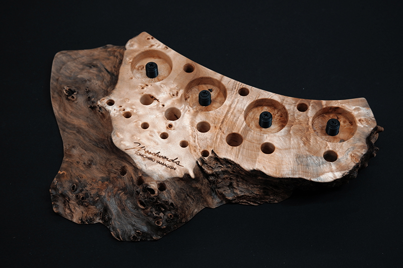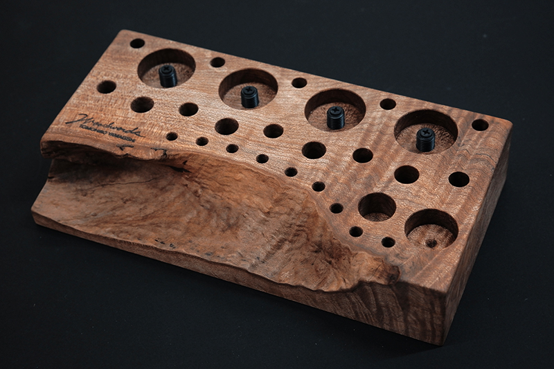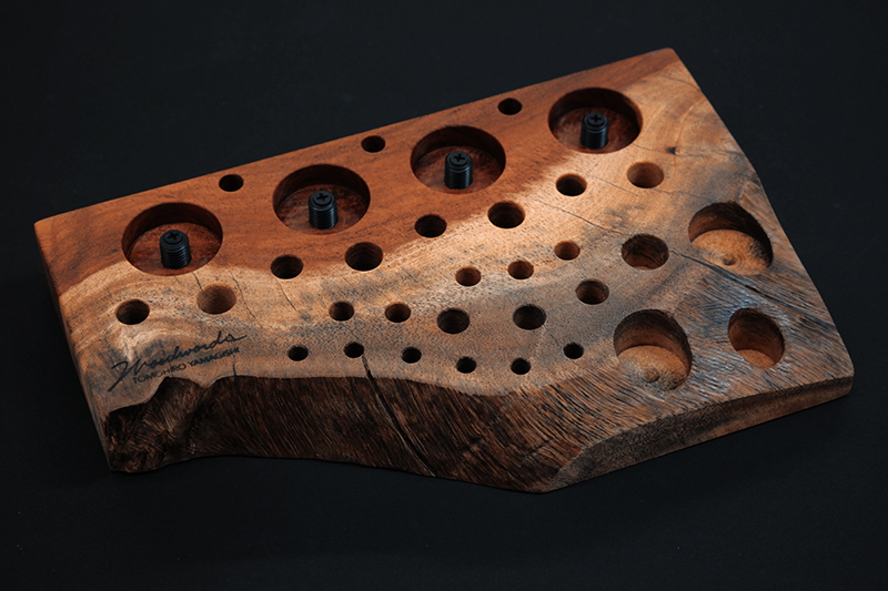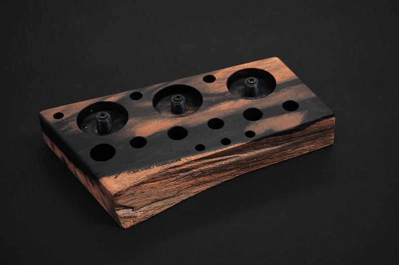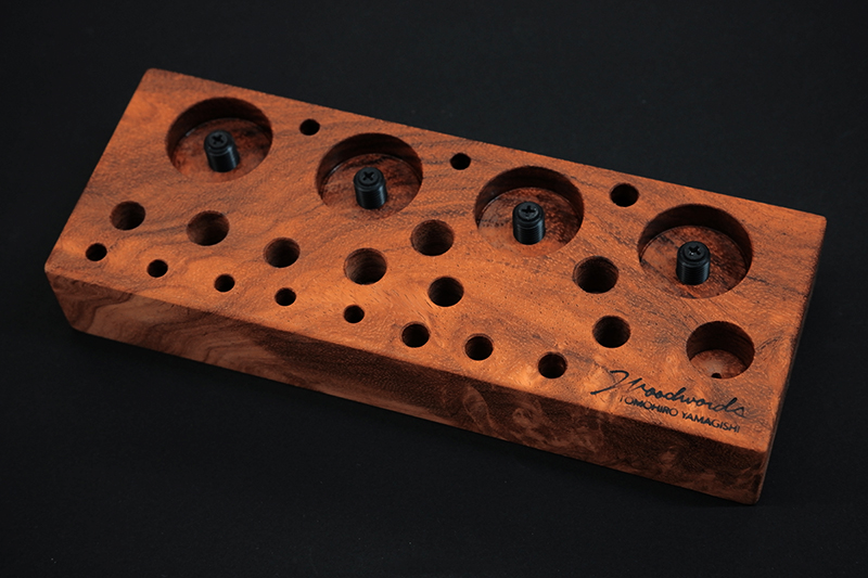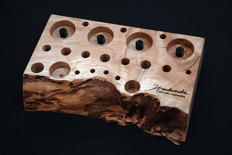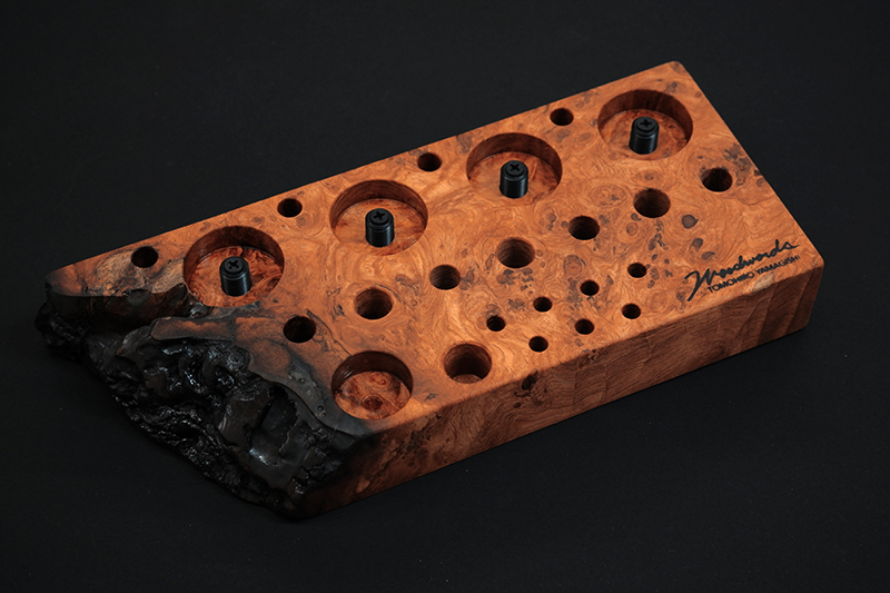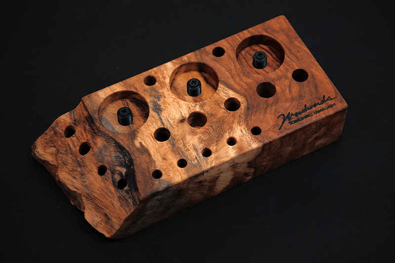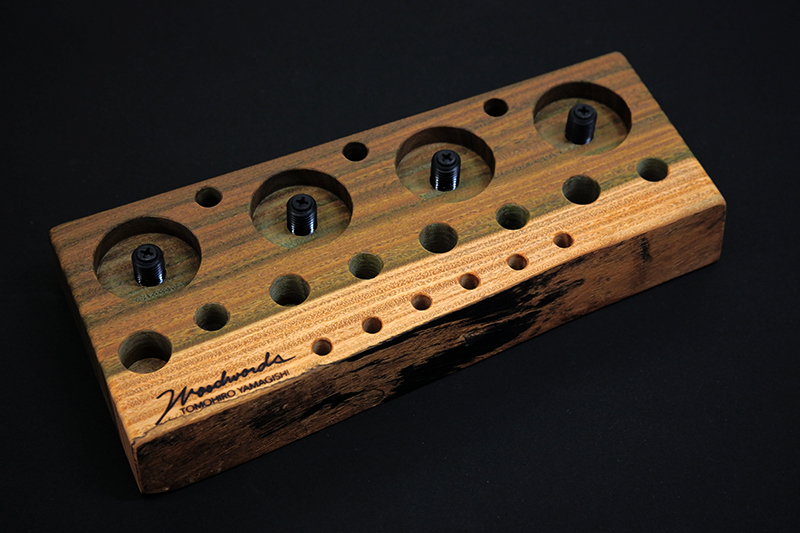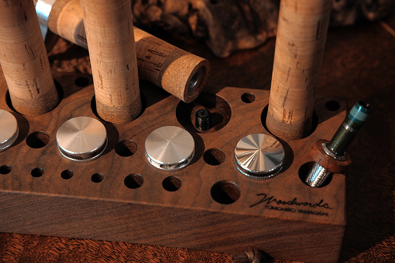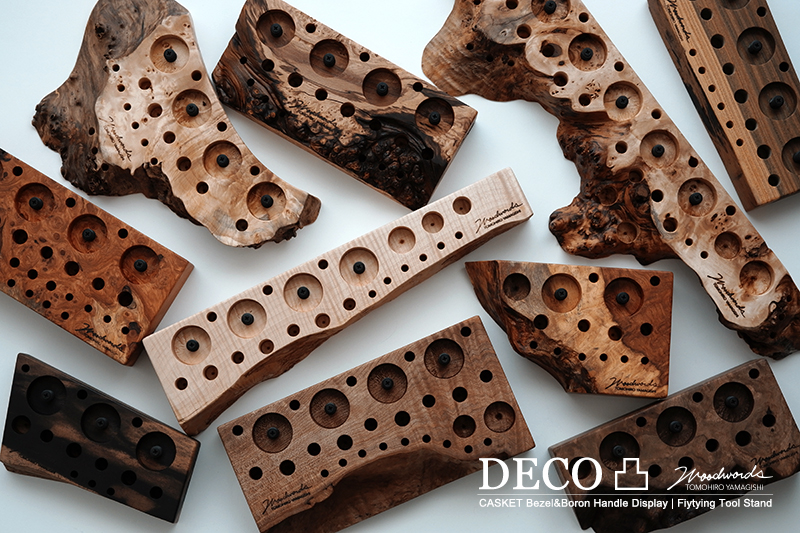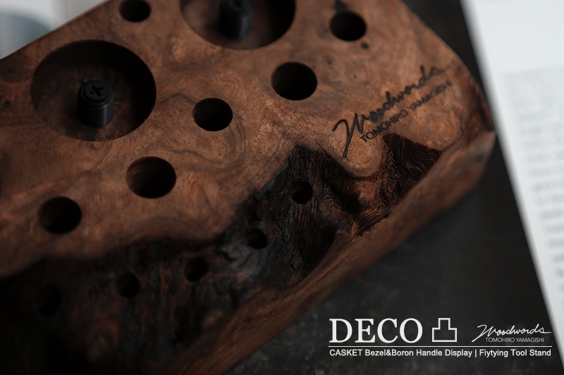 さておき、このツールスタンドはウッドワーズのヤマギシトモヒロがTクラフト時代に生み出した「BOKO凹」というツールスタンドを僕がカスケットロッドのエンドネジを取り付けてもらって、ネジの形から「DECO凸」と呼ばせてもらっている兄弟のような商品です。ヤマギシトモヒロが銘木端材に命を吹き込み、センスよく穴を開けてツールやグリップを数本ディスプレイすることができます。