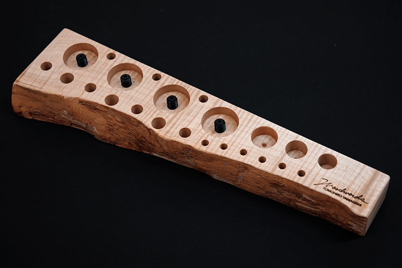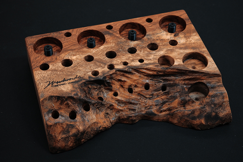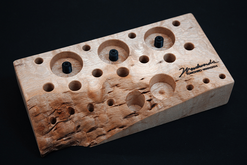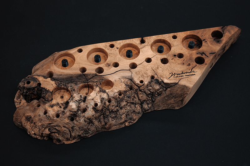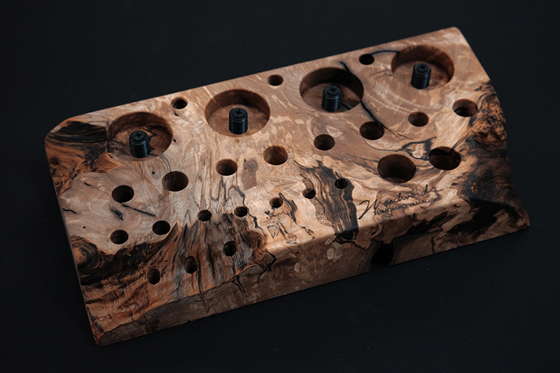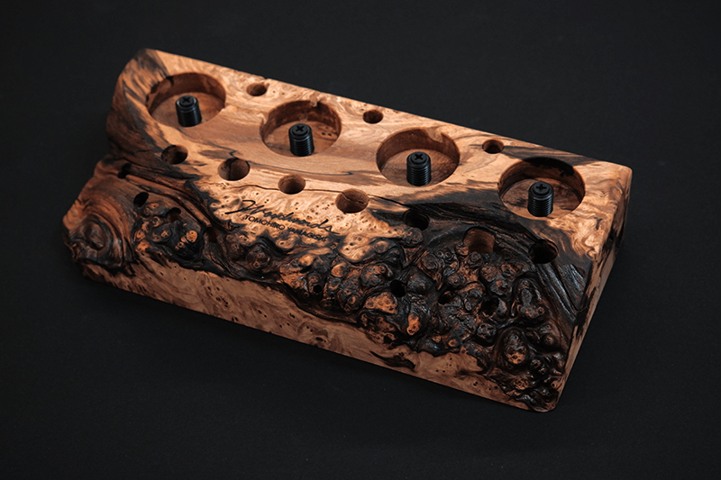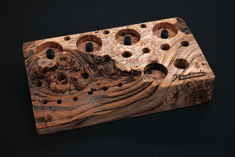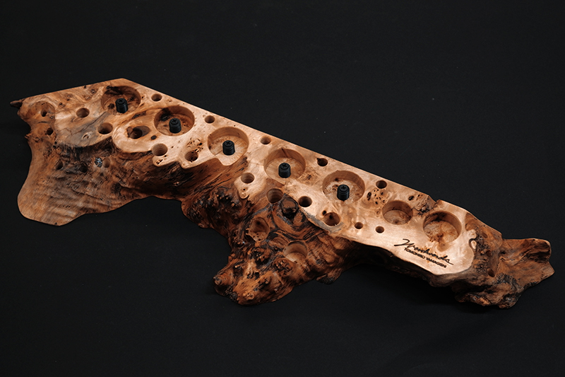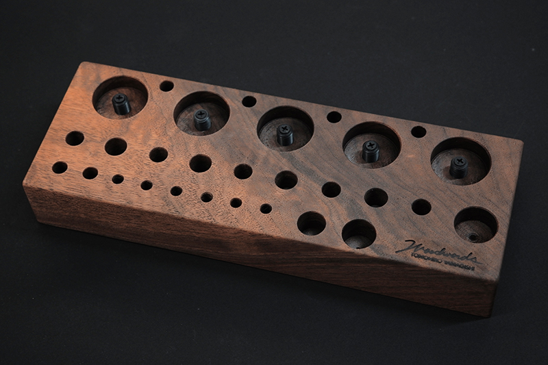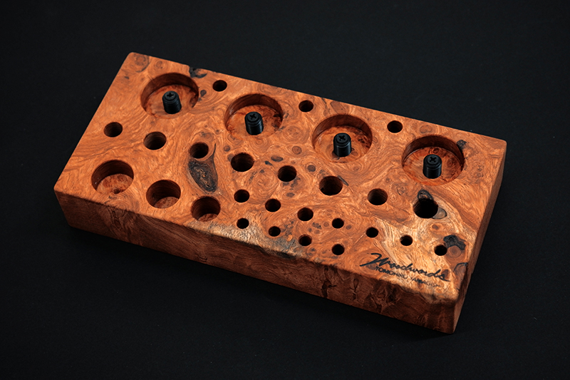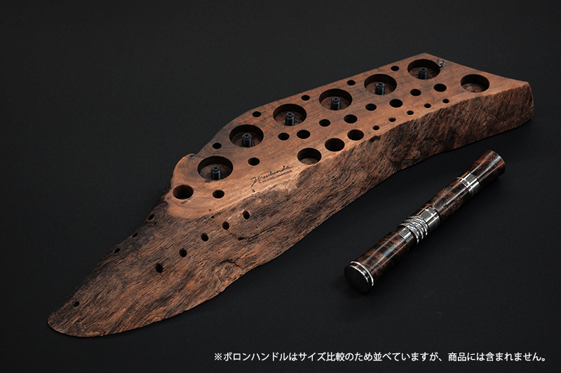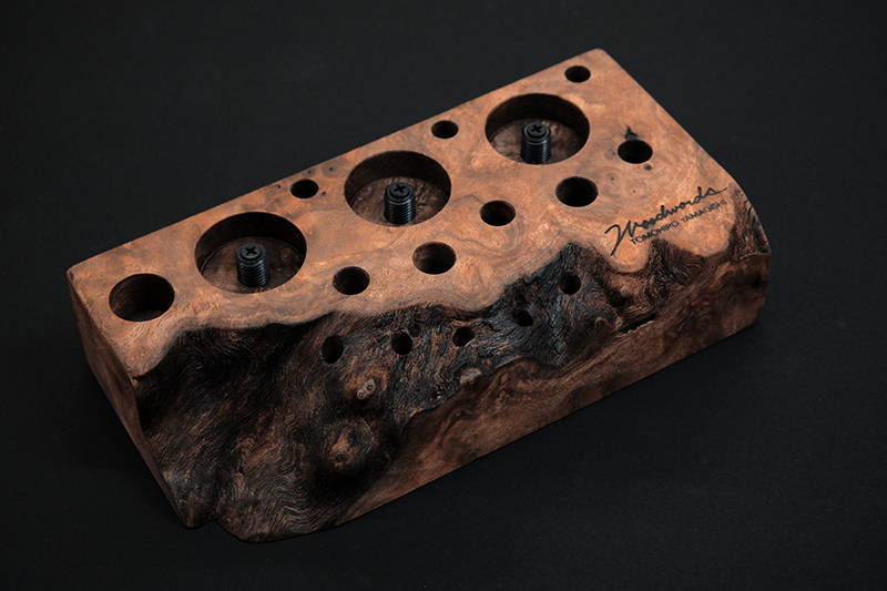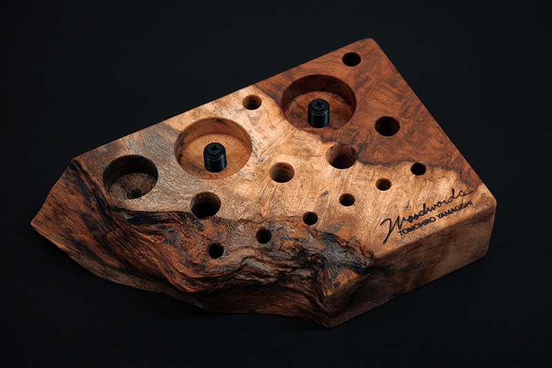 さておき、このツールスタンドはウッドワーズのヤマギシトモヒロがTクラフト時代に生み出した「BOKO凹」というツールスタンドを僕がカスケットロッドのエンドネジを取り付けてもらって、ネジの形から「DECO凸」と呼ばせてもらっている兄弟のような商品です。ヤマギシトモヒロが銘木端材に命を吹き込み、センスよく穴を開けてツールやグリップを数本ディスプレイすることができます。