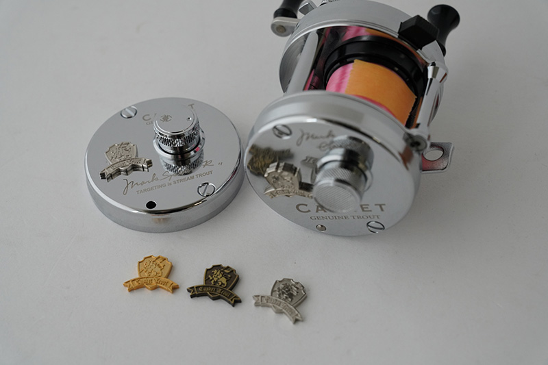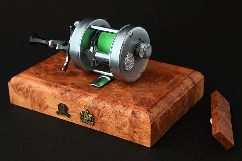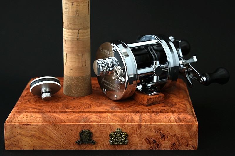 機能上の大きな特徴は、フット置きの木製プレートを可動式にしてあり、360°好きな角度でディスプレイ可能な点。またリールフットを固定しないシンプルな構造にしたことで、オフセットフレームを組んだ2500cや各社の様々なリールも置いていただく事が出来ます。