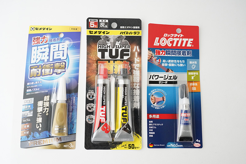 接着は耐衝撃の瞬間接着剤で行った場合5〜15分ほどで行えます。接着剤は多種ありますが、最も簡単なのは耐衝撃・瞬間接着剤です。高温対策としてジェルタイプの瞬間接着剤も良いです。さらに二液式の高温対策のエポキシ接着剤も推奨です。(上写真)