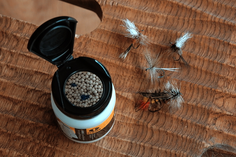 繊細なCDCをはじめあらゆるマテリアルのフライに対応。何がいいって生地に挟んで吸水するタイプではないので、毛鉤のハックルやウイングも型崩れしにくい。容器の口が大きいので大型フライにも難なく対応してくれます。
