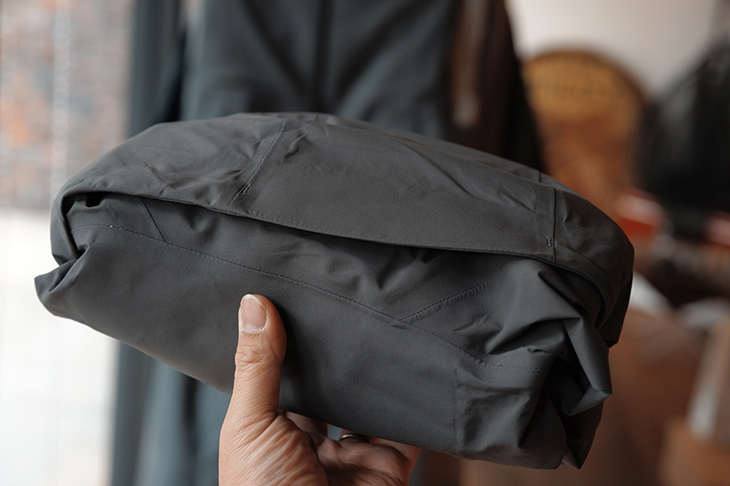 3層ゴア、大容量ポケット、大きめのフード、防水カフなど、フルスペックを求められるジャケットはどうしても大きく重くなりがちですが、新しいG3ガイドジャケットならこの通り。フードに本体を入れて畳むととてもコンパクト。これならベスト背面に備えたり、パックに入れて常備するにも苦になりません。