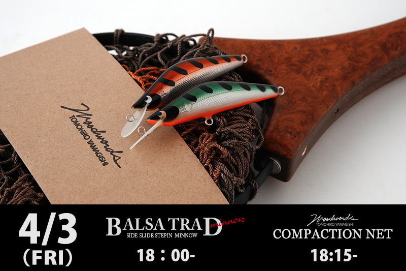 4月03日(金曜日)にバルサトラッド「BT61HS & 61SHS」、コンパクションネット「BigGame40(40cm内径)」の販売会を行います。スケジュールは以下の通りです。明日よりコンパクションネットのラインナップをご紹介します。ご期待ください。