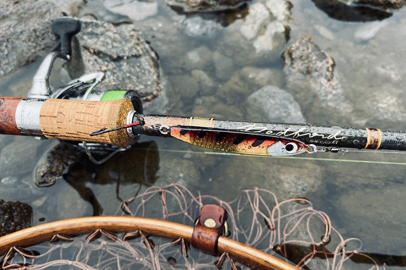 裾にはシムスのスローガン「FISH IT WELL=悔いなき釣り人生を」の文字。ふと岩に腰を下ろすと目に入って、気分を上げてくれるデザインです。ちなみにシャツのボタン一番下を外しておくのは個人的なコダワリ。(←単に動きやすいだけです。笑)