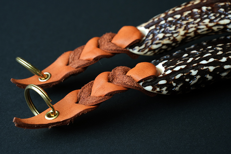 コア部分は、マメ科ツルサイカチ属の銘木で英名ローズウッドとして世界中に名を轟かせる銘木の中の銘木「紫檀」。 黒檀、鉄刀木と共に唐木三大銘木の一つとされ、その種類の多さと複雑さ、銘木としての歴史は群を抜いており、紫檀のみで一つの世界が広がっていると形容したくなるほど。まさに沼への入口とも言える樹種です。暗色の杢肌は光にかざすと、赤褐色の中に黒が混ざり、わずかに紫掛かったの色彩を帯びた褐色であることに気が付きます。絹のように滑らかな質感、重厚かつ繊細な色彩は見れば見るほどに味わい深い銘木です。
