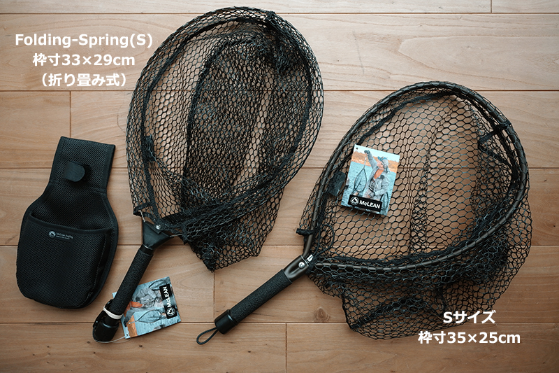 Sサイズは渓流や管理釣り場でも使いやすいフレーム枠寸を持ったネット。通常のフルアルミフレームに加え、折り畳み式(シース付き)も展開しています。
