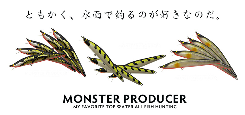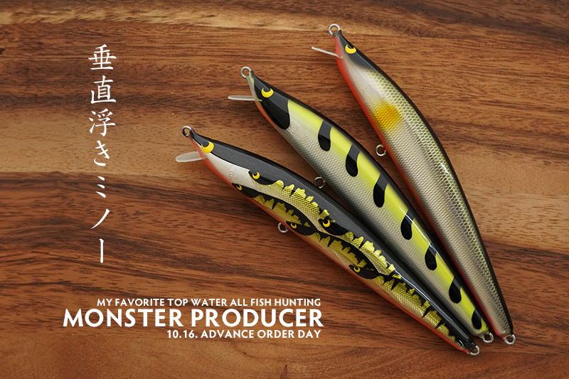モンスタープロデューサーは特殊なミノーです。後方重心で飛距離は素晴らしく、ただ巻きでも十分釣れるミノーですが、止めたらもっと大きな鱒が掛かりますよ。アクションはリーリングだけでダイブ、ウオブンロールで誘い、止めれば垂直浮きで水面に素早く浮上します。この水面直下での動きが老練な魚にも見破れない秘密です。ゆっくりと静かに下からMP(エムピー)の動きを見て、最後に自分の捕食場所(体勢)に来ると一気に襲います。それが起こる場所は多くは岸際近くであることを覚えていてください。今回はご覧の3色。これからご投稿とともに紹介します。