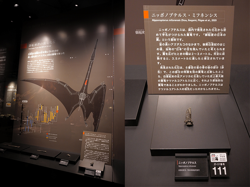 約30年前に発見され、今年2025年の5月ついに新種の翼竜として認定された「ニッポノプテルス・ミフネンシス」(←ネーミング最高!!)の本物の出土化石も展示してあります。