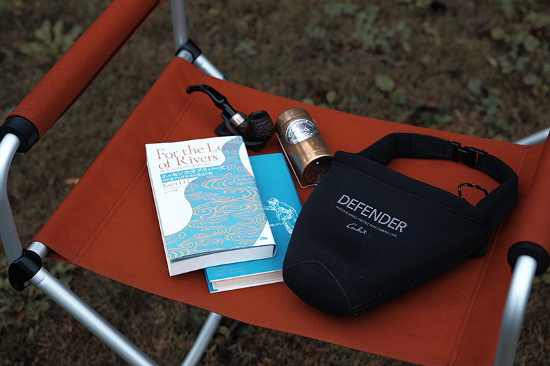 翌朝はキャンプサイドでチェアに座って読書とパイプで趣味を満喫。今回の旅でも肌身離さず身につけていたのは「ディフェンダー」。これほど信頼できるカメラケースは未だもって他にありません。