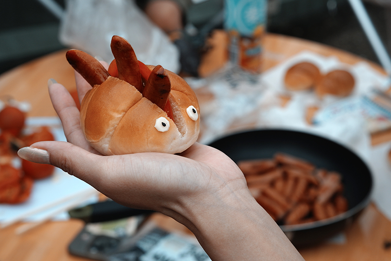 朝ごはんは、恐竜パンを作って大満喫の恐竜旅行を締めくくりました。ロールパンにフレッシュなトマトとウインナーを挟んで、チーズの白めとゴマの黒目をつけたらハイ完成!子供達にはこれが一番の思い出になったようです。