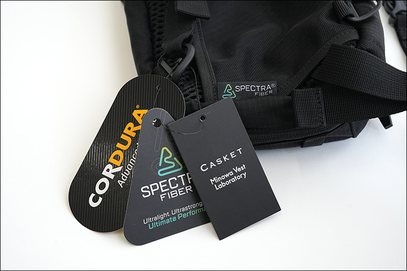 ひっ張り強度は恐ろしく高い反面、瞬間的な衝撃には弱いダイニーマですが、圧倒的な粘りを備えるコーデュラナイロンと組み合わさる事で、互いの弱点を補完し合う理想的な混合生地。見た目にわずかな光沢とグリッドのような表情もあり、カスケット別注ならではのデザインに仕上がっています。