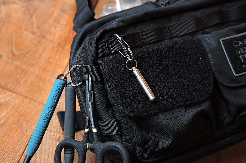 11月4日に販売開始の別注チェストバッグ。お昼に引き続き、外部ポケットと装備をご紹介します。なんと言っても数多ある国内メーカーのベスト製造を請け負ってきたミノワベストラボラトリーですから、その設計技術とノウハウは本当に素晴らしい。このチェストバッグもあらゆる要所にアクセサリー用ループやリングを設置。ルアー、フライなどスタイルを問わず、様々な使用状況を想定されているのです。