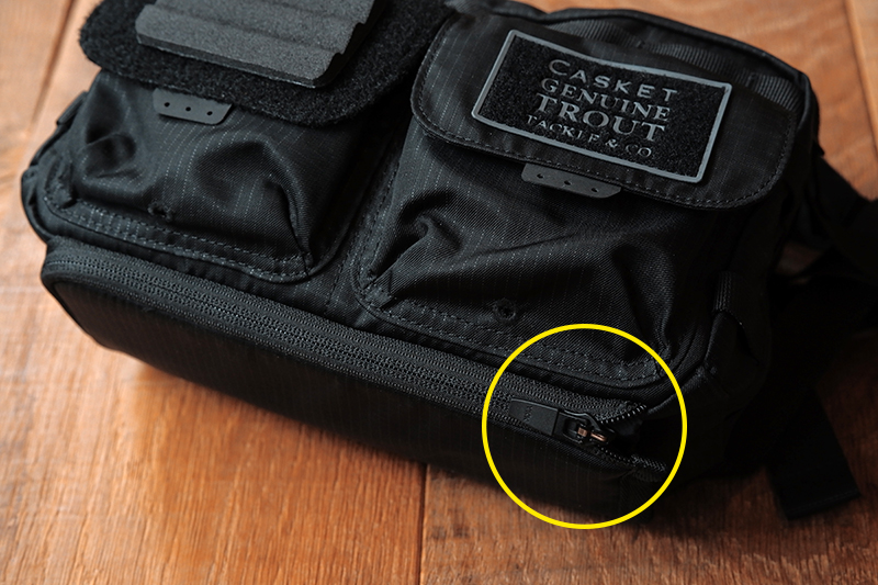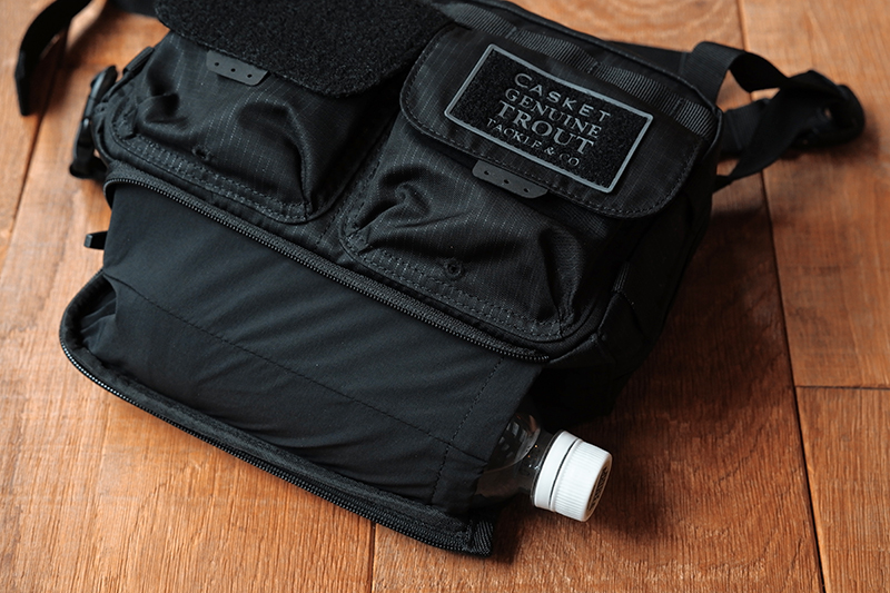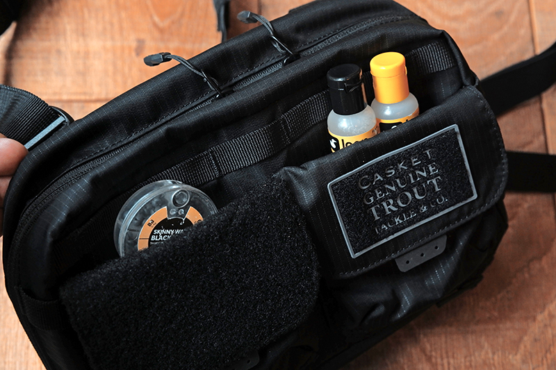 フロントポケットとバッグ本体の間もポケットになっているという、隙のない設計。僕は使用頻度の高い小物(フロータントやシンク剤、シンカーなど)を入れています。