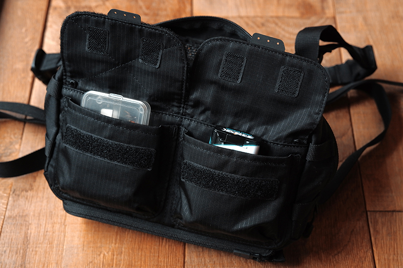 マチを設けたフロントポケットはベルクロフラップ付きで小型のボックスなどを安全に収納することができます。頻繁に出し入れする物はメインコンパートメントよりもこちらに入れている方が使いやすいです。何も入れなくても、厚みのあるものを入れれも確実に留まるベルクロ付け方、の位置設計にもご注目。こう言った細部にこそ設計力の違いが現れます。