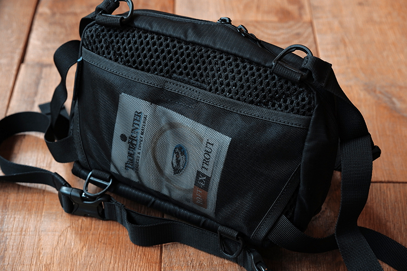 背面はメッシュポケットになっており、薄いものを収納可能。通気性を損なわないメッシュ素材を用いながら、硬質で耐久性が高そうな素材使いはさすが。下段にはDリングも備えます。