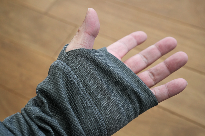 さらに袖には指穴がついており、手の甲を冷えから守る簡易グローブの機能もあり。よく出来ています。製品名の「Strata」とは地質学で「階層」を表す言葉。つまりレイヤリングを意味する美しいネーミングのアンダーウェアです。