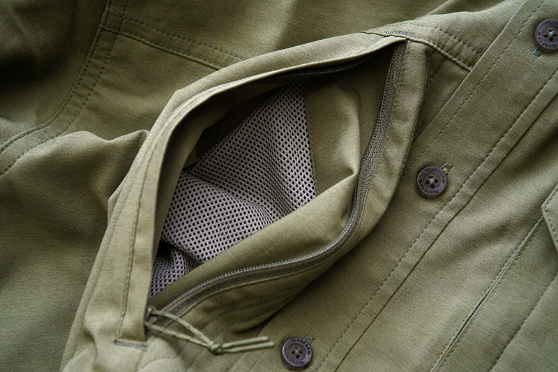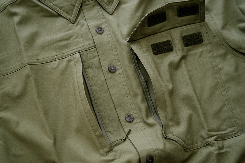 その他、基本的な構造やサイズ感は共通です。フィッシングシャツたるメイン機能は大容量のポケット.両胸にジッパーポケットを備え、さらに左胸にはフラップ付きポケットを搭載し、あらゆるギアを収納します。