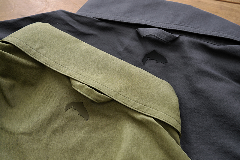 首元にはシムスのトレードマーク「ジャンピングトラウト」と、フックなどに吊るしておくためのハンガーループを搭載しています。