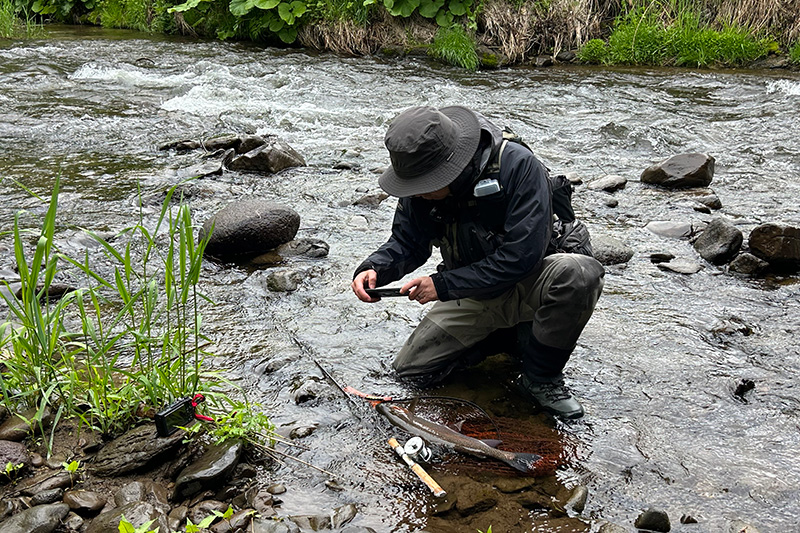 バルサトラッドとコンパクションBT(ビッグトラウト)。来週発売を予定しているまさにそのセットの投稿を寄せたのはカスケットのロッドアセンブリ職人である石田裕一郎です。50cmを超える魚体に石田も撮影に夢中です。ロッドは自身で組み立てたアウトバックビリーバーOBB604MT。