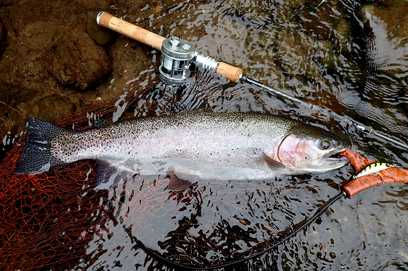 続いてこちらはウッドワーズのヤマギシトモヒロ。こちらも同じようなタックルで見事なニジマスですが、気になるのは6ftボロンハンドルのオールウッドかもしれません。ブランクはアウトバックビリーバーOBB674MT。