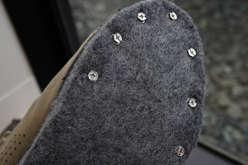 フェルトの交換は町の靴修理店で出来ます。その際、スタッドは自分抜いていきましょう。専門家が専用の機械で圧着するので、しっかり着きますが念の為、前後にスタッドを打つとより安心だし、減りも抑えられます。