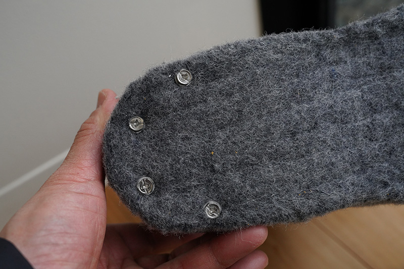 これは厚さ15mmのフェルトを貼り付けたばかりで、一見分厚くて歩きにくいようにも見えるかもしれませんがウールはとにかく減りが早いのでこれくらいあってもすぐに減ったり、多少は圧縮されるので薄くちょうど良くなります。濡れた岩場で滑るのは怖い。ウールフェルトは疲れた帰り道の油断も助けてくれると思います。