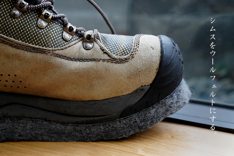 最近のシムスブーツはアクリルフェルト採用していますが、減りを遅くするために固くなっているように感じます。結果、岩の凹凸へのフリクションが効きにくいと思います。そこで僕はデフォルトのフェルトが踏み固めてしまったらウールフェルトに交換をお勧めします。