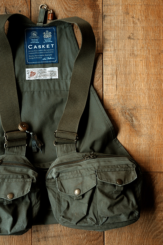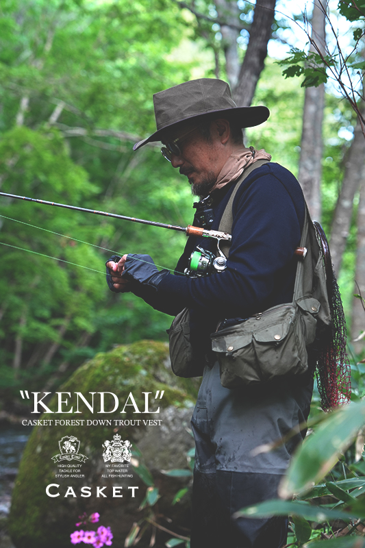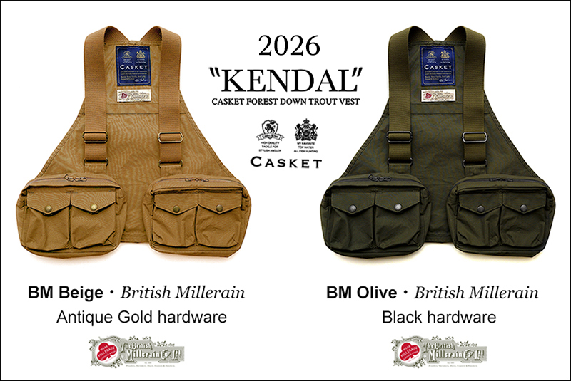 私たちカスケットが、鱒釣りに必要な全てを集約した渾身のフィッシングベスト「KENDAL」。デザイン、機能、生地の全てにおいて販売以来、今もなお最高と言い切れる自信の一枚です。製作はフィッシングベストにおける国内随一のスペシャリスト集団「ミノワベストラボラトリー」です。 2026年版はベージュにアンティークゴールド金具、オリーブにブラック金具が装着されます。 生地は昨年と同じ、英国ブリティッシュミラレーン社のワックスドコットン。布帛として恐ろしく高価ではありますが、優れた耐久性に加え、素晴らしいエイジングを見せてくれる最高品質のものです。 様々な生地を検討しましたが、現時点でこれを超える生地は見つけられていません。 また「レギュラーサイズ」に加えて、引き続き「プラスサイズ」もラインナップ。身幅を左右+5cmずつ延長し、厚着をする際や、体格の大きな方も着用しやすいサイズとなっています。(画像は2025年版カラー) プラスサイズは1箇所だけ変更点があり、フロントショルダーストラップも+5cm延長出来るよう設計を改めました。これによりさらに幅広い方へ対応する事が可能となっています。 ルアー、フライ、フィッシングウェア&ギアを幅広くカバーする当店だからこそ設計できた、あらゆるアングラー、シチュエーションを考慮した一枚。クラシックなストラップベストにおいて現代最高峰のベストであると断言します。