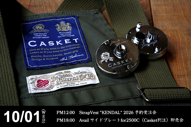 オフシーズン販売会の第一回目となる10月01日は、お昼にストラップベスト”ケンダル”の2026年版の予約受注会、夕方はアベイル社のサイドカップセット(カスケット別注)の即売会を行います。詳しいスケジュール、販売内容は下記の通りです。