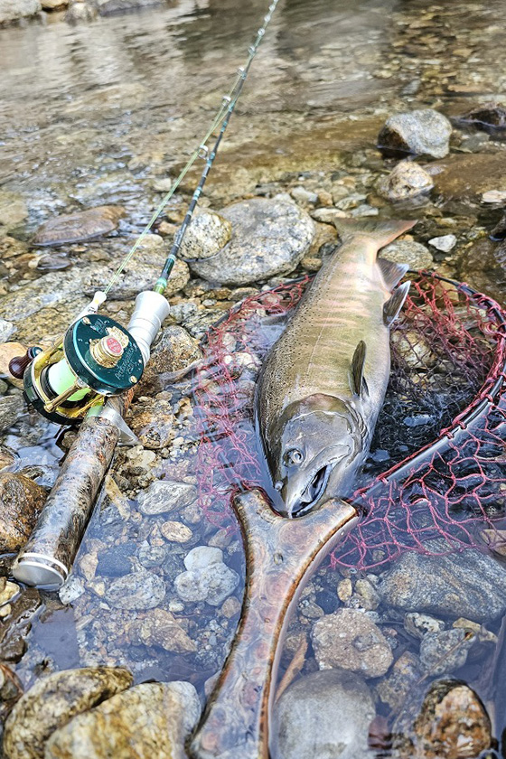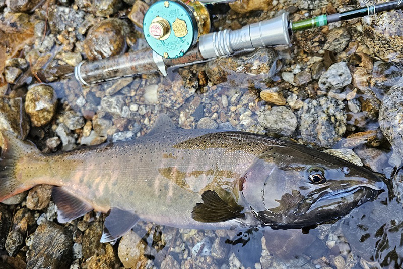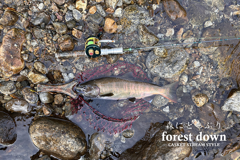 上へ行ったり下へ行ったり。橋の上からだがざっと50cmはありそうなサクラマスがフラフラしている。ルアーを結んでそっと川に降りる。通るであろうコースにルアーをナチュラルに流すとすーっと追いかけて行く。手元にクンッとあたりがあったが猛烈な引きはない。抵抗もほとんどなく、すんなりとランディング。魚体を見て納得。産卵前後どちらか分からないが尾鰭もすり減り全体的に非常に弱々しい。いずれにしても極力負担はかけたくないので、撮影は一瞬で済ませて即リリース。 ロッド カスケットブランクのハンドル&グリップ ボロンハンドル アルセドクライマー ACB514ML ルアー トラッドミノー TRAD-R50SHS ランディングネット その他 ライン その他(PE0.6号※リーダートラウトプラッギン5lb) いつもカスケットタックルで楽しい釣り時間を過ごさせていただいています!今シーズン最後の山女魚です。来シーズンもどうぞよろしくお願いいたします。