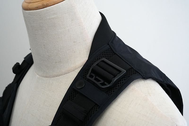 これだけの積載ならばと、首元にはクッションパネルを設置して首の負担を軽減。ウェアを設計する技術を取り入れることで着心地にもこだわられている点は流石としか言いようがありません。バックル下に見えるベルトはロッドホルダー。全てのパーツが樹脂製で淡水、海水を問わないのも同社ベストの特徴です。
