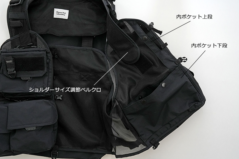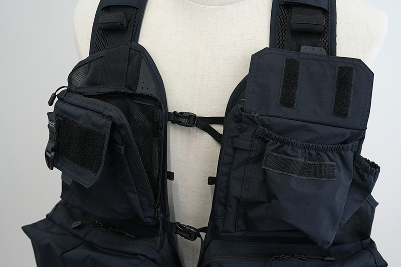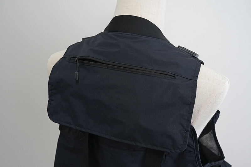 内側にももちろんポケットをMAX搭載。左右ともにスナップボタン留めの大型ポケットを上下に備え、裏生地はメッシュ素材を使用することにより通気性も十分に確保。