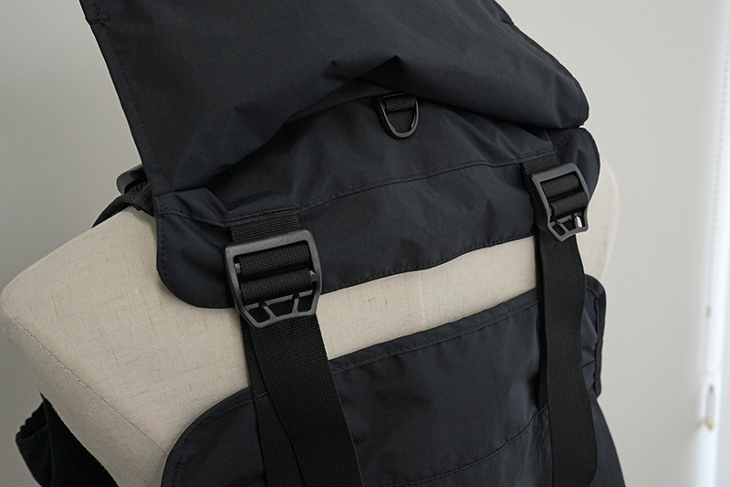 背面パネルがこれまた技あり。分割されたセパレート構造になっており、上段大型ジッパーポケットを備えます。レインウェアなどの収納に便利そうです。