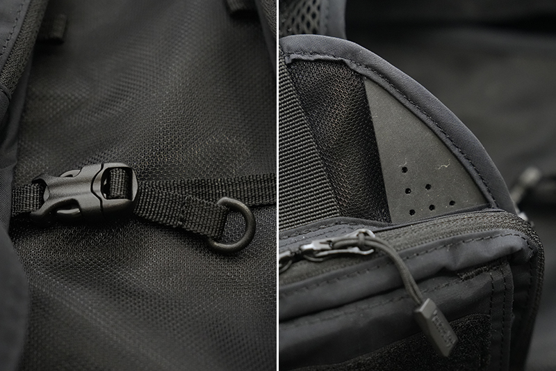 サイドから見た図ですが、向かって左側が背面パネル。下段は着たままアクセスできる大型サイドジッパーポケットになっており、大型ルアーボックスやドリンクを収納可能。ご覧の通りサイドパネルは硬質なメッシュで通気性抜群ながら、強度も十分。2段式のベルトでフィッティングの微調整もできます。