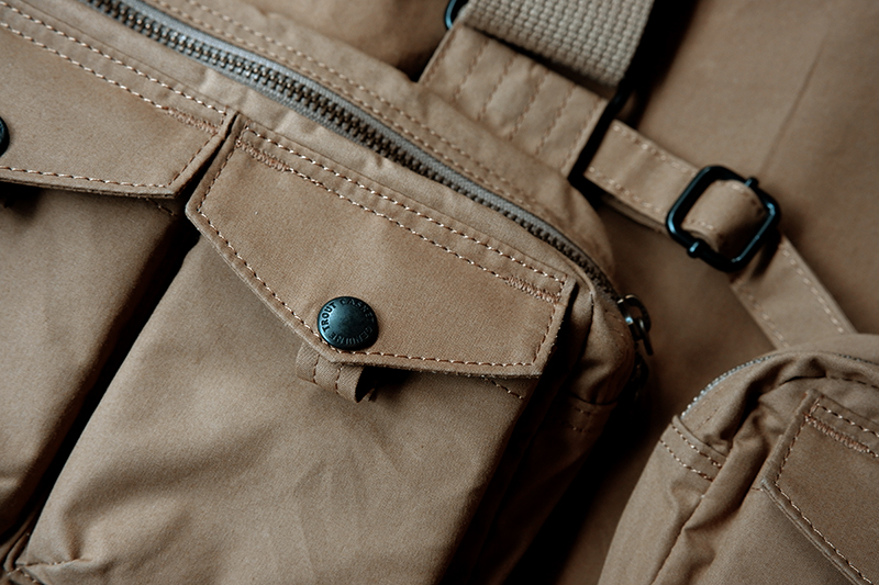 フロント上段は、左右ともにL字の大型開口部を持つジッパーポケット、その外側にフラップポケット、さらにサイドに小物ポケットを備えています。