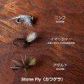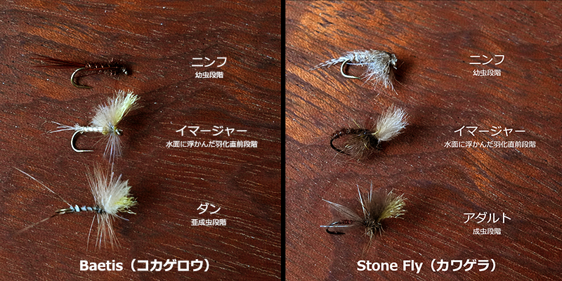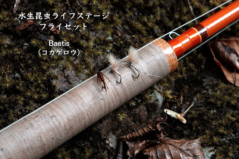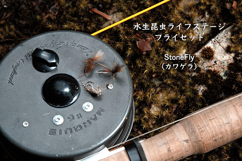 九州でも先日から朝夕はすっかりと秋を感じる気温になってきました。渓流の風は涼しさを増し、川辺にはあちこちに栗が落ちていました。僕はフライフィッシングをするようになって、いっそう季節の移り変わりや自然に対する関心や興味が高くなったと自分で感じています。 移ろいゆく自然を観察し、考えて毛鉤を投じる。時には全く相手にされない事もあるけれど、そこに魚の反応が返ってきたなら、少しだけ自然を理解できたような、一体になれたような満足感が得られます。 自然を知る事、学ぶ事。釣果はもちろん大切だけど、それ以外にも自分を満足させてくれる要素が満載なのがフライフィッシングだと思います。 フライマンなのに虫嫌いという悲しい性を持つ僕ですが(苦笑)、それでも虫の研究は本当に面白いものです。そこで、水生昆虫の生態を勉強しながら釣りを楽しむための「ライフステージ・フライセット」を企画。製作はプロフィッシングガイドのポップレンジ垣内氏の手によるものですから、その品質は折り紙つきです。 水生昆虫を代表する「カワゲラ」と「カゲロウ」で、それぞれ「幼虫=ニンフ」、「羽化途中=イマージャー」、「成虫=アダルト」といった3種類をセットにしています。 観察と検証、釣りもしながら虫の生態もお勉強できるという、なんだかチョットだけ博識になったような気になれるフライセットが完成しました。 もうじき禁漁ではありますが、秋の夜長に大人の自由研究として楽しんで下さいませ。