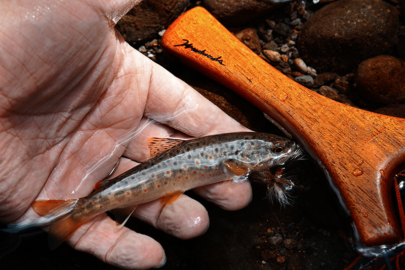 先日、久しぶりに人里離れた源流部へ山女魚を釣りに出かけました。 こんな崖を何度も登ったり降ったり・・・(笑)水中よりもはるかに陸上を歩く事が多いこの様なシチュエーションでは、ビブラムソールの歩行力が結構心強いと感じます。僕はG3ガイドブーツのビブラムを愛用。軽さやグリップ力ではフライウェイトシリーズに譲りますが、過酷な遡行を物ともしない耐久性はG3ならでと感じます。 この日は、旧カスケットスタッフ「シゲ」こと椎葉さんと一緒に超源流部を釣り上がりました。僕らには壁のように見える崖を、相変わらずトントントンっと簡単に駆け上がる様子はさすが。さながら鹿の様なのです(笑) そんな彼は新しくなった「フライウェイトブーツ」のビブラムを愛用。変わらない軽さと向上した剛性感に「なかなかイイよこれ!」と太鼓判を押していました。 岩陰に隠れながら、ポケットウォーターを丁寧に探っていきます。こんなリーダーから先しか出ていない様な至近距離をコントロールしながらポンポン打っていく釣りには、スコット社が誇るファイバーグラスロッド「Fシリーズ」が本当に使いやすいです。 この時期のこのポイント、例年ならコカゲロウ系が吹雪のように舞っているハズ・・・だったのですがこの時まだ気温が低い事もあってか全く不在。わずかにカディスが飛んでいる様だったのでエルクヘアカディスに変えると見事に反応してくれました。ロッドはFS723/5。 傷一つない魚体、ビッシリと入ったパーマークや黒点、濃密な色合い。この日、最も美しい一尾は椎葉さんが仕留めました。ロッドはスコット50周年モデル「F703/4(完売)」。源流山女魚の琥珀色の胸鰭に、ハニーカラーのブランクが見事にマッチしていました。 椎葉さんの毛鉤はテラシマフライの「レトートホッパー」。もとはバッタのイミテーションとされますが、そのシルエットはまさしく大きめのカディスにも通じてます。この日はとにかくカディス系が大正解。(不思議なくらいそれ以外に魚が無反応・・・) ひと通り釣り上がったところで、お腹がグゥ〜。実は今日、釣れた山女魚はキープしてあるのだ!さーてこの後は待ちに待ったランチターイム!!