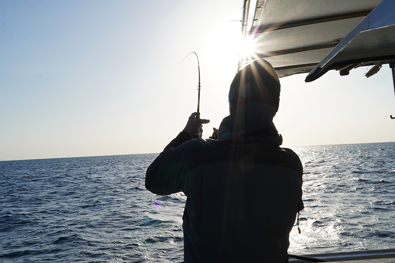 ALBA丸(今村真央船長)さんでの釣りです。港を出てすぐに広大な海原に出たかと思うと「はい、ここで投げてください。」と拍子抜けするくらい漁場が目の前なんです。